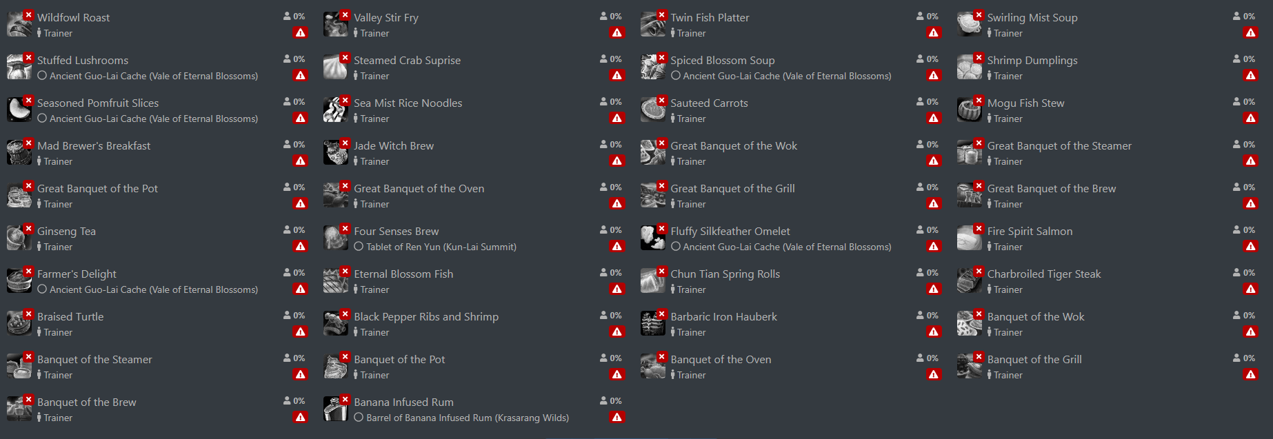 Некоторые из этих проблем незначительны – например, в данных отсутствует фракция Чесночника из ковенанта Ночного Народца в Shadowlands – но другие имеют гораздо более серьезный характер. Типичный пример: рецепты кулинарии из Пандарии. Data for Azeroth выделяет десятки рецептов кулинарии Пандарии, которые просто отсутствуют в API, хотя все остальные рецепты кулинарии из игры отображаются им совершенно нормально. Весьма вероятно, что это связано с тем, что рецепты Пандарии являются особенностью профессии в нескольких подразделах, которые нужно "изучить", как если бы они были специализациями, но точно это может знать только Blizzard. Это не новая проблема: самое раннее известное сообщение об этой неполадке с API