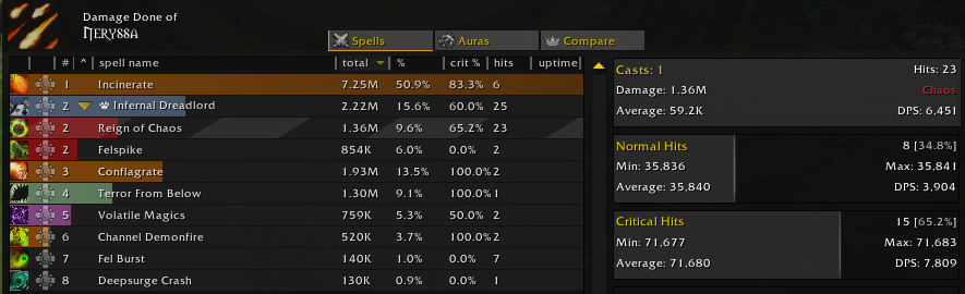 Однако их эффективность сильно зависит от специализации персонажа. В частности, у большинства бойцов ближнего боя и танков они наносят в 15-25 раз больше урона, чем у многих заклинателей. Вот наглядное сравнение нанесенного за период в ~30 сек. урона для охотника на демонов "Мести" и чернокнижника "Разрушения" примерно одинакового среднего уровня экипировки.