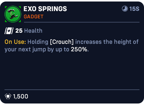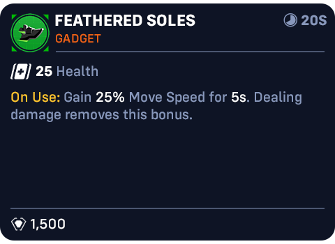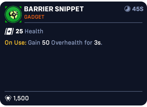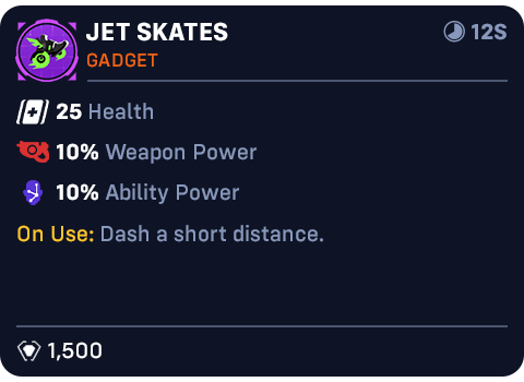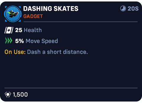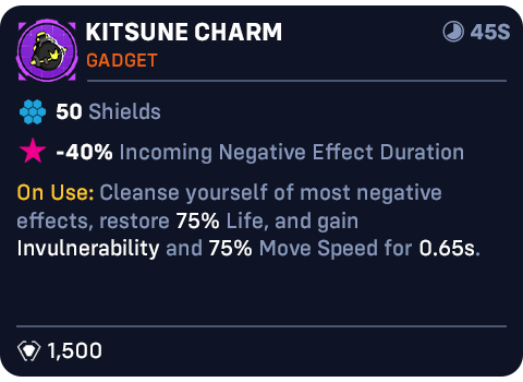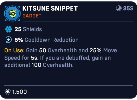 Many Gadgets are versions of existing Hero abilities that scale in power based on their rarity. You can get a taste of Freja’s swiftness with Dashing Skates or jump onto high ground like Baptiste with the Exo Springs Gadget. When borrowing Hero abilities, we were careful to make the Gadget version less impactful than the real thing to avoid infringing on a Hero’s niche. For example, Kitsune Charm is modeled after Kiriko’s Protection Suzu but only offers a cleanse to your Hero instead of everyone in range on a much longer cooldown.