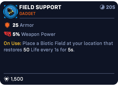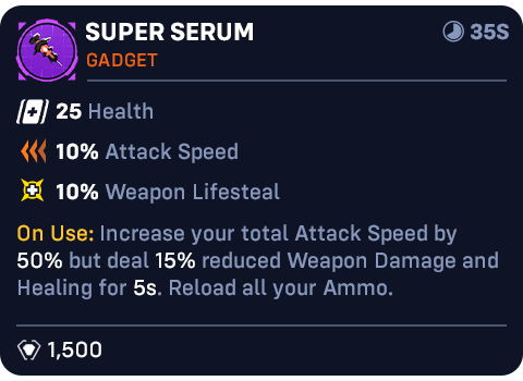 • Super Serum: With a whopping 50% increase to Attack Speed on cast, this Gadget is ideal for Builds based around Weapon power, on-hit effects, or effects that trigger after a certain number of shots. You’ll deal slightly less damage for five seconds, but you'll be attacking so quickly that the other team won’t be around long enough to notice.