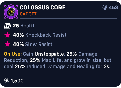 • Colossus Core: On use, this Gadget gives you Unstoppable as well as Max Life and Damage Reduction. Since you’ll deal 25% reduced damage during the cast, Colossus Core serves as a great capstone for Tank Heroes who are focused on making space instead of getting Play of the Game.