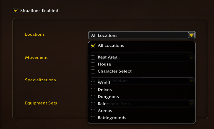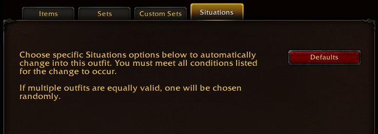 С нарядами связана другая крупная новинка системы трансмогрификации – ситуации. Каждому наряду можно задать набор условий, в которых персонаж будет автоматически им снаряжаться. Для этого в меню трансмогрификации нужно выбрать желаемый наряд, перейти на вкладку "Ситуации" и установить галочку на "Включить ситуации". Далее можно выбрать условия, в которых персонаж будет принимать этот наряд: