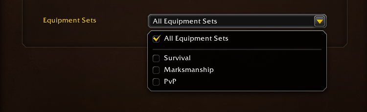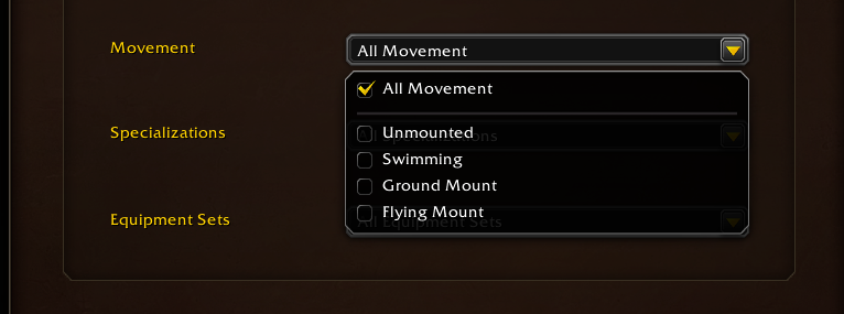 • Специализации: все специализации; та или иная специализация класса персонажа; та или иная сохраненная пользовательская сборка талантов