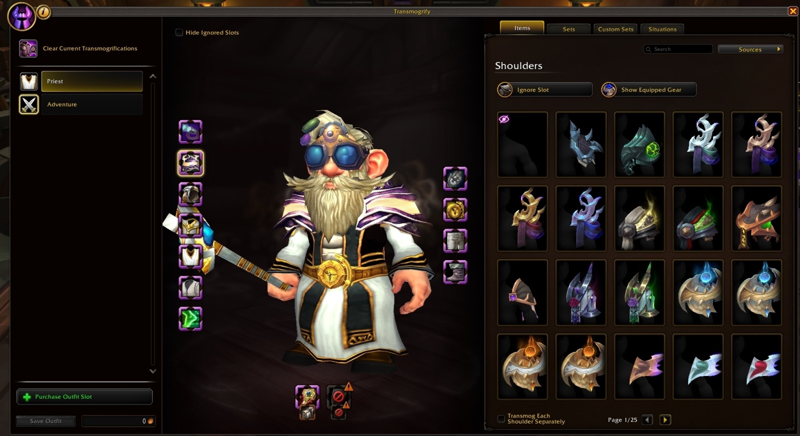 В грядущем дополнении Midnight окно трансмогрификации будет переработано и обновлено под современный вид, сохранив все старые функции и получив несколько новых. В центре окна располагается модель персонажа с его снаряжением. Слева – список нарядов. Справа – несколько вкладок: