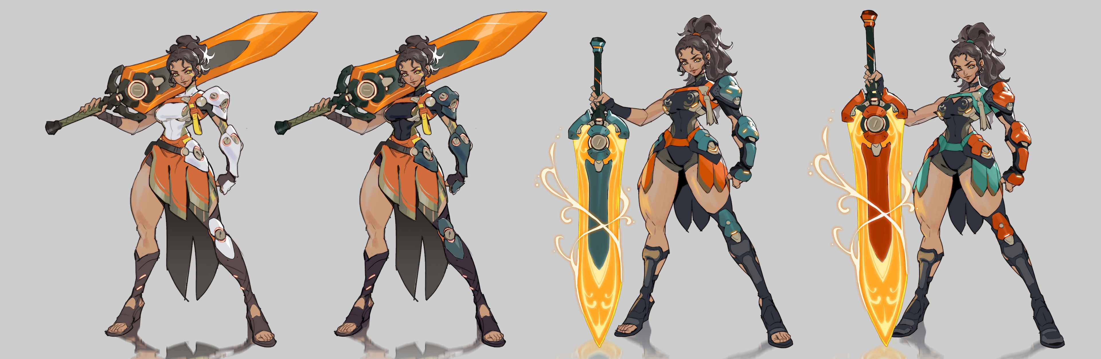 Early Vendetta concept art.The team knew they wanted to create a sturdy Hero and looked at the art of crusaders, gladiators, and other heavy-hitter concepts to guide them. “We knew the role and the archetype, so we started having conversations about what this hero would look like, what their silhouette would be,” Kenny said.