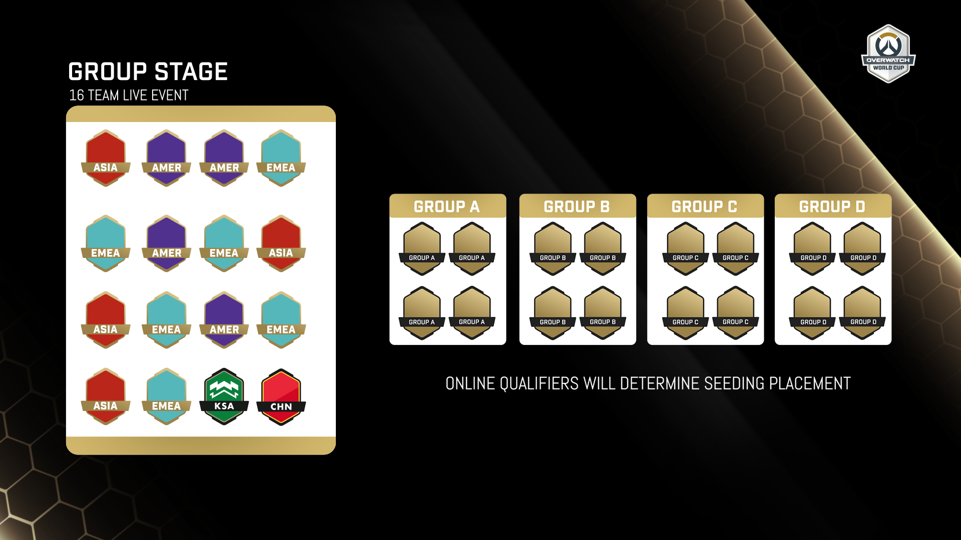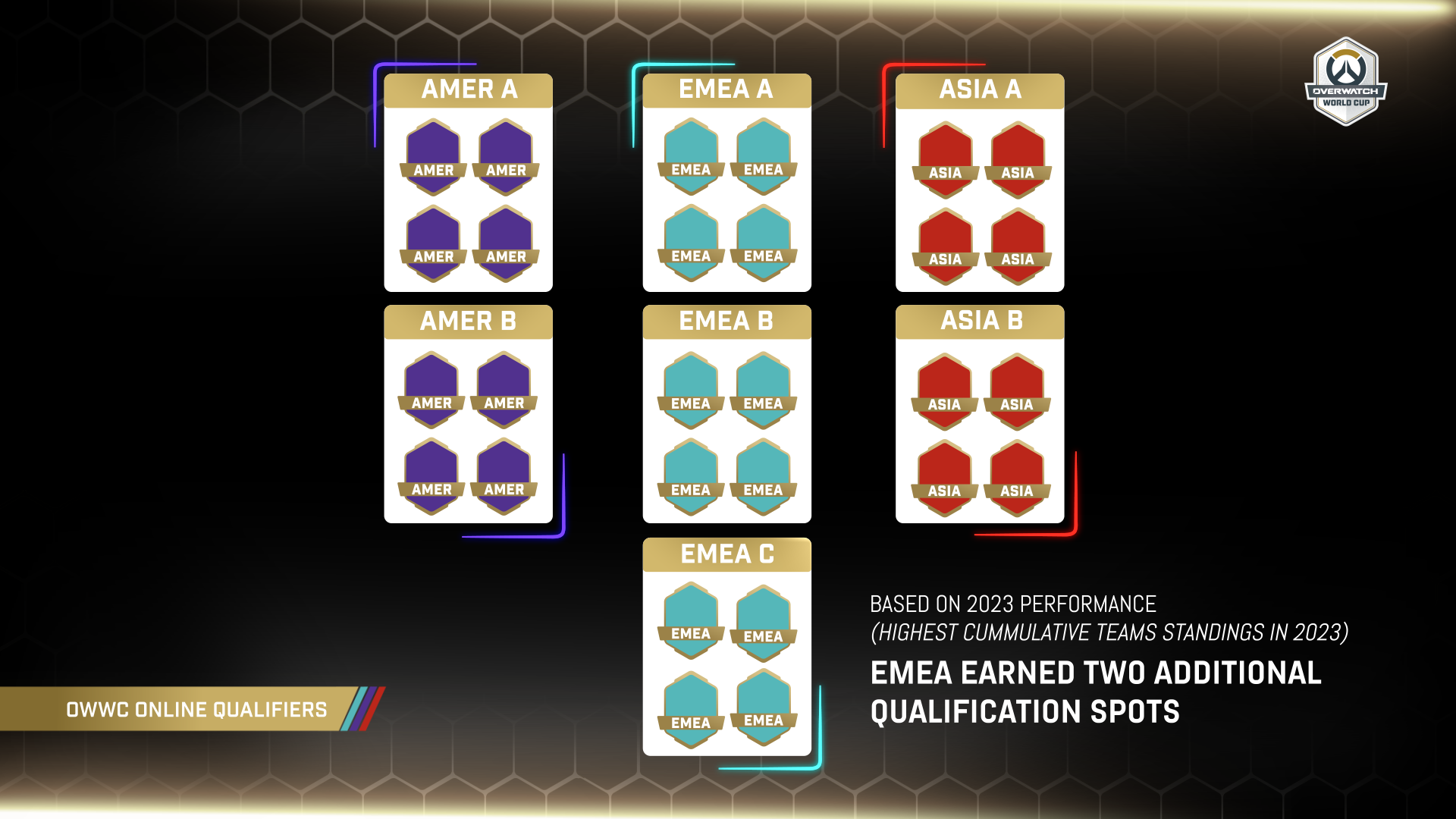 Online Qualifiers (24 Teams - Summer 2026)28 teams compete within Conference groupings optimized for location and connectivity: AMER A/B, EMEA A/B/C, ASIA A/B. The top two teams from each Conference will advance to the Group Stage along with the standing Champions and runner ups from the Overwatch World Cup 2023, Saudi Arabia and China.