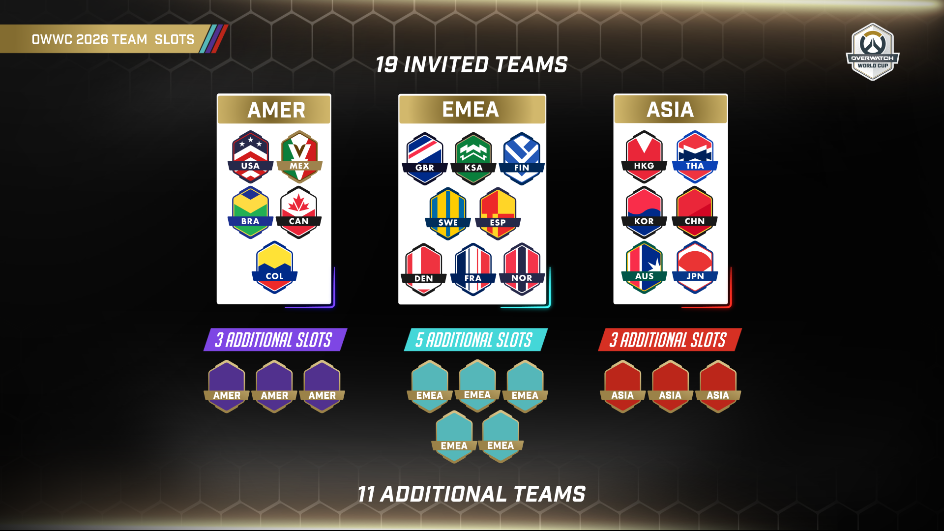Overwatch World Cup 2026 TeamsIn 2026, 30 teams will compete in the OWWC: 19 invited teams and 11 wildcard teams. Invited teams were selected from the top 16 teams in 2023 and the 3 top performing teams in EMEA. The 11 wildcard teams will earn their place via Conference Cups, a new part of World Cup in 2026. It’s time to ready up, represent your team, and make history as the best OWWC team. Being part of the OWWC isn’t just about competing on the big stage, it’s about embracing the competitive spirit of the program and uplifting your fellow players. Even if your country/region doesn’t end up being part of the 30 selected, you will have the opportunity to participate in the program - read on to find out how!