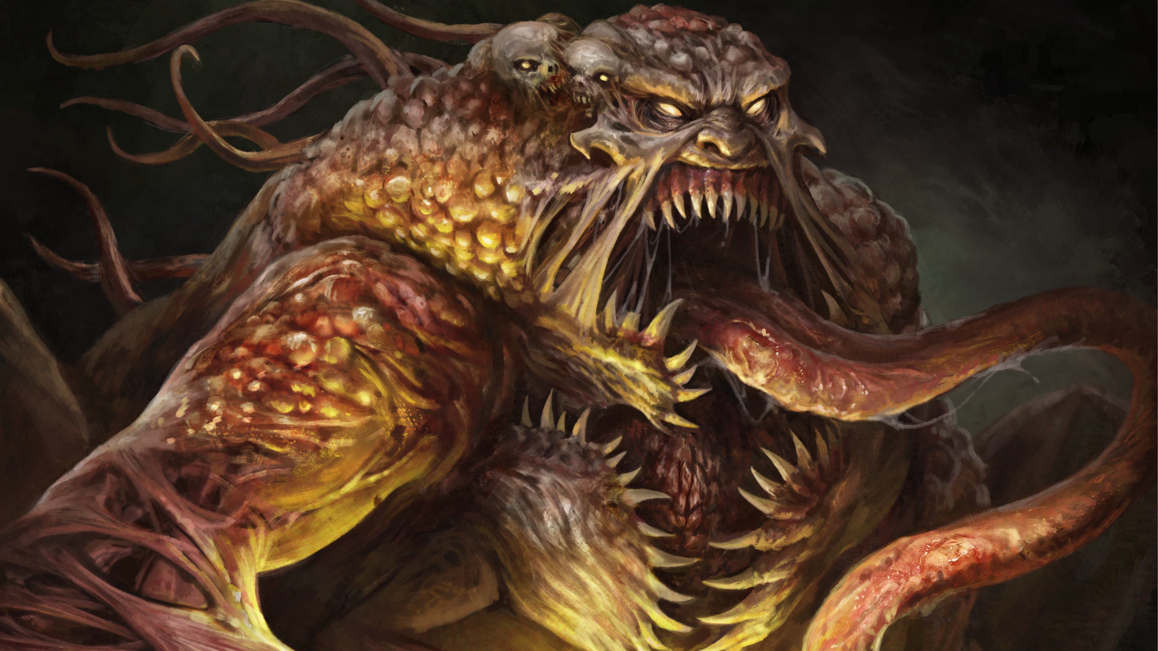 In his search for weapons of war, Albrecht sought to create a Shardborne capable of ending battles within seconds. With the power of creation, Albrecht continuously transformed one of his Shardborne followers into a completely new creature. With its swollen gullet and strong legs, Bloatmaw leaps across battlefields, crushing prey and spewing miasma. In an instant, the toxic gas envelops entire legions, warping and melting flesh in the Shardborne's twisted image.
