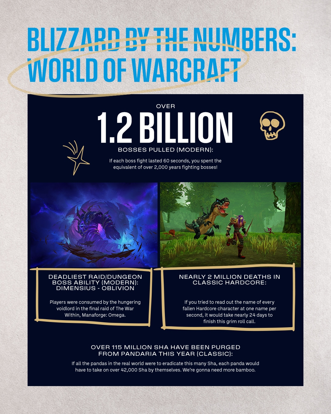 • В Mists of Pandaria Classic было повержено более 115 млн. разных ша, и если бы панды из реального мира взялись за эту задачу, на каждую из них пришлось бы более 42.000 ша (и море бамбука)