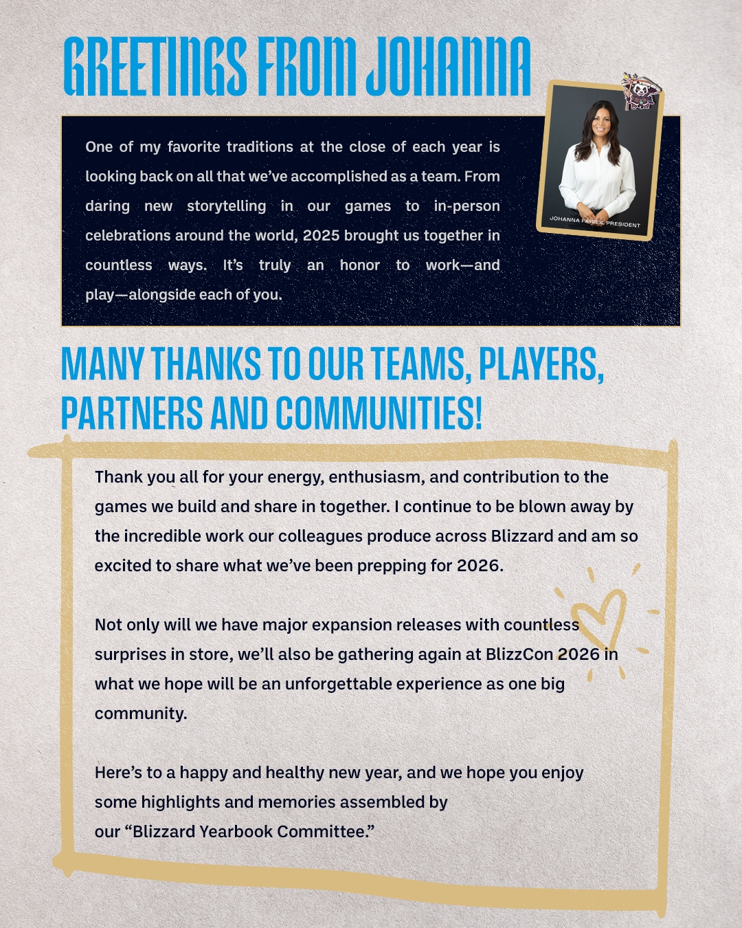 • Фэрис поблагодарила игроков, команды и партнеров за замечательный 2025 год и всю ту энергию, энтузиазм и вклад в развитие игр компании, который все они сделали. Она отметила, что 2026 год обещает быть очень интересным, ведь помимо запуска нескольких крупных дополнений и кое-каких сюрпризов также еще состоится и BlizzCon.
