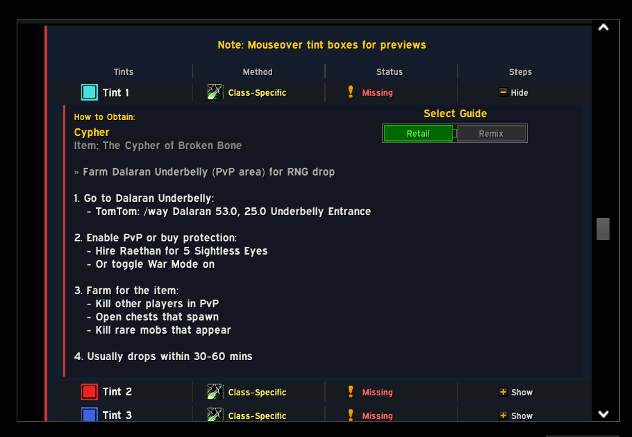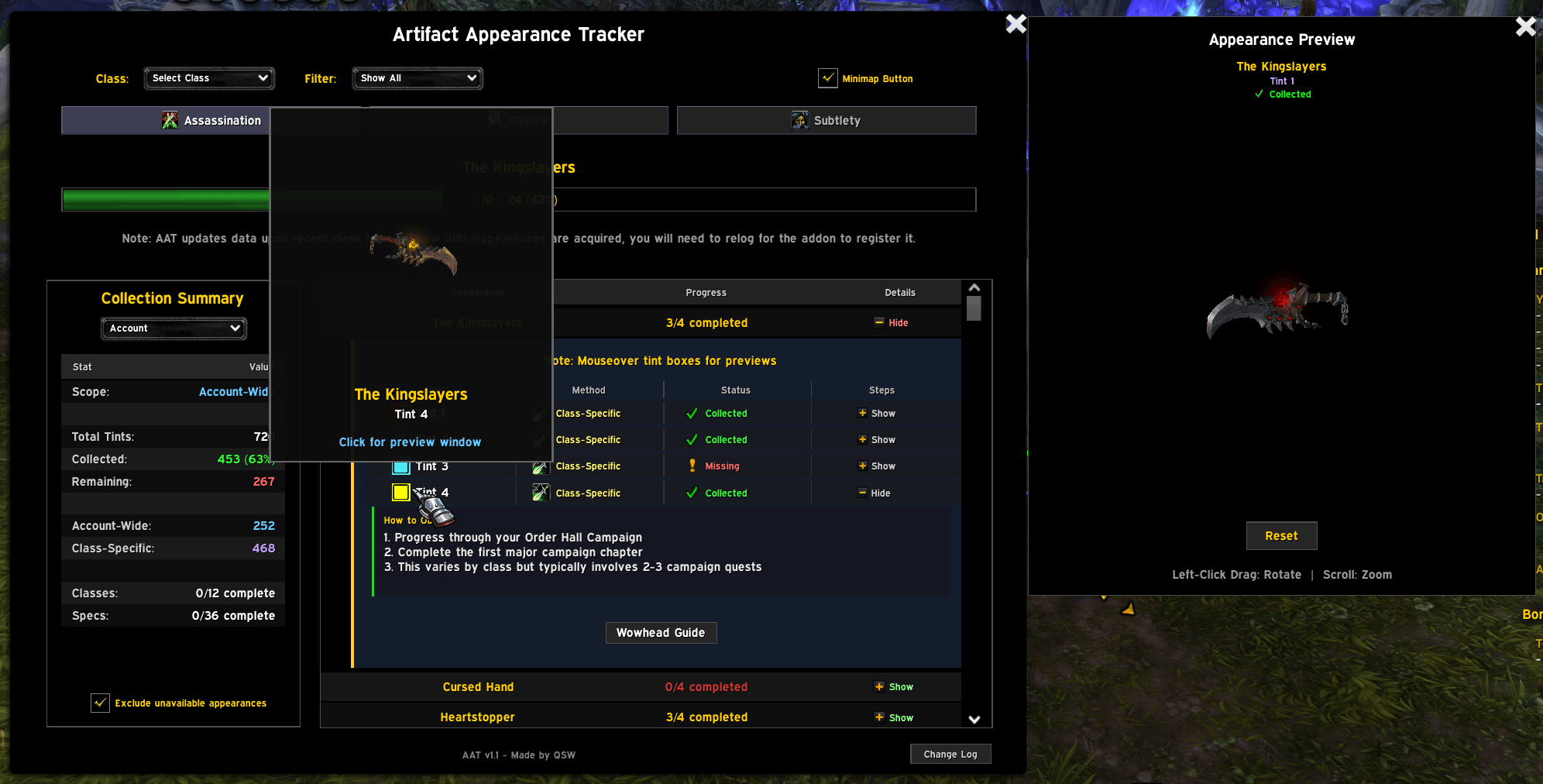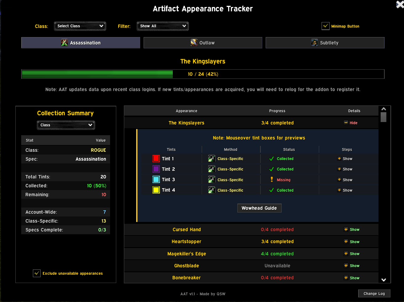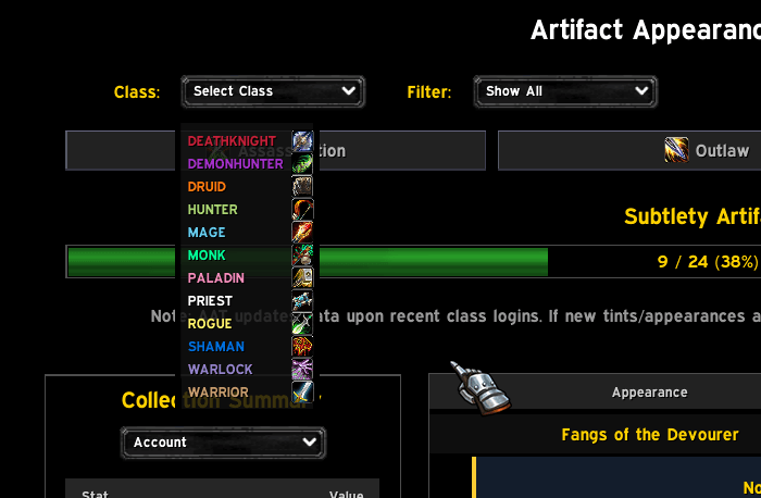 Дополнение Legion добавило по артефакту каждой из 2-4 специализаций 12 существовавших на тот момент классов, а каждый предмет оружия сверх того имеет по 6 обликов в 4 расцветках, что в сумме дает 864 уникальных образа. Даже играя с тех самых времен далеко не все стремящиеся к этому игроки смогли собрать полную коллекцию, причем не только из-за сложностей в получении, но и из-за проблем в отслеживании прогресса. В помощь заядлым коллекционерам игрок по прозвищу Qsw написал удобный аддон.:cut: