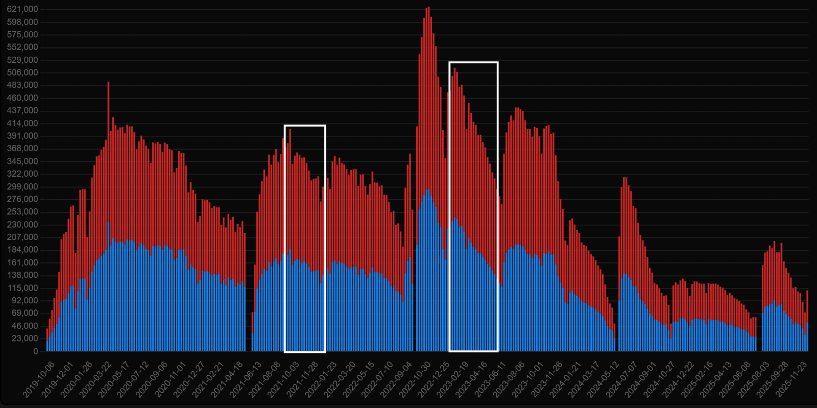 В белых прямоугольниках отмечено падение игроков после начала 2 фазы Burning Crusade (тир5 рейды) и ещё более заметное падение после начала второй фазы Wrath of the Lich King (Ульдуар).
