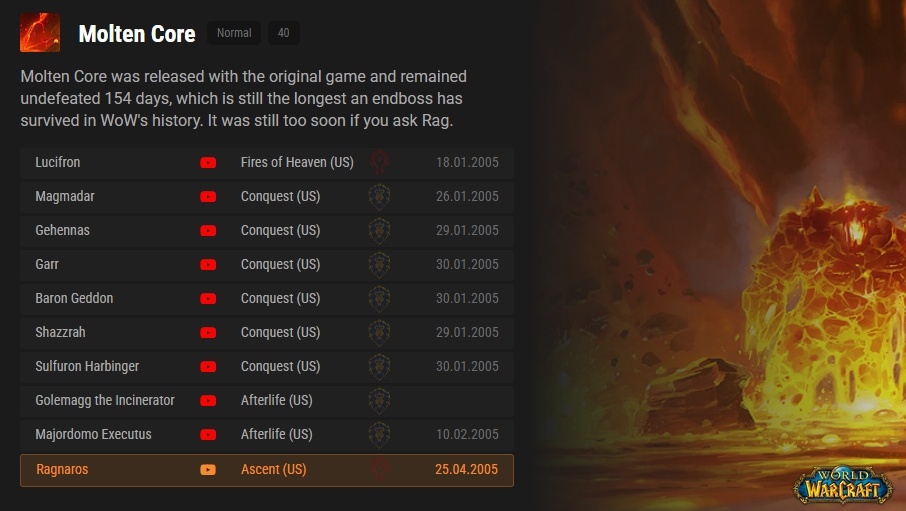 20 лет назад, когда вышли Огненные недра, прошло целых 154 дня прежде чем рейд был зачищен целиком. Целых пять месяцев! На освоение Логова Крыла Тьмы ушло уже 77 дней. В те дни Бритвосмерт считался серьёзным испытанием. Промотаем чуть вперёд. Во времена Burning Crusade Леди Вайш также прожила больше 70 дней, прежде чем была убита, а Крепость Бурь и того больше – с релиза рейда до момента полной зачистки прошло ни много ни мало 130 дней.