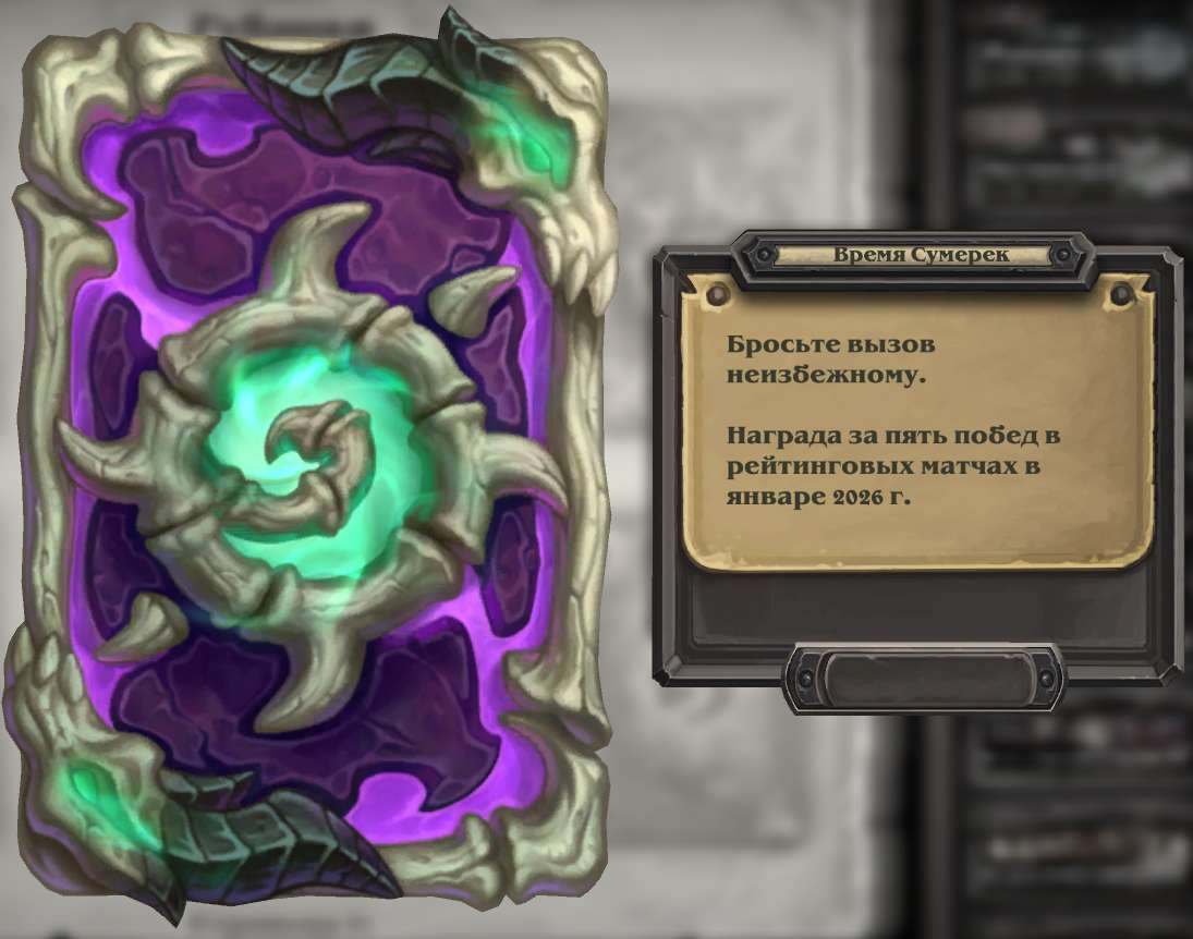 Наступил январь 2026 г. и в Hearthstone начался 142 сезон рейтинговых игр, за участие в котором можно получить зловещую рубашку для карт. Одержите 5 побед в рейтинговом режиме в течение этого месяца, и вам сразу же достанется рубашка "Время Сумерек", которая поможет вам влиться в ряды культистов Сумеречного Молота.