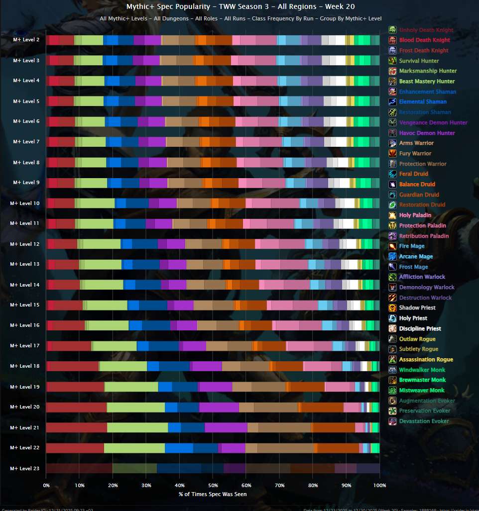 Благодаря разделу "Stats" на RaiderIO мы имеем доступ к расширенной статистике об успехах (и неуспехах) игроков в прохождении эпохальных+ подземелий. 20 неделя 3 сезона The War Within подошла к концу, и теперь можно взглянуть на некоторую общую картину в этом режиме. Складывается она следующим образом.:cut: