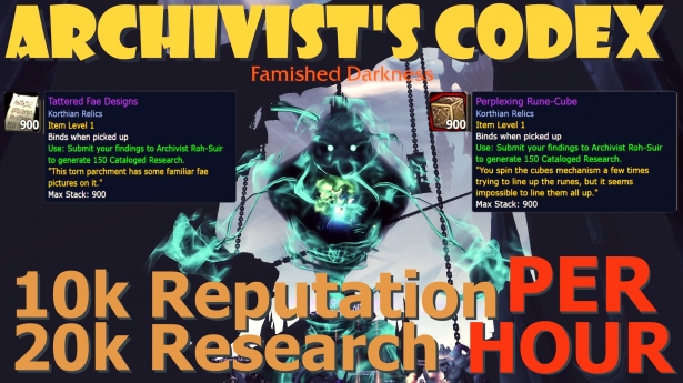 Сегодня я поделюсь с вами совершенно сломанной стратегией быстрого накопления репутации с Кодексом архивариуса или Исследований каталога!В обновлении 9.1.5 были усилены существ внутри разломов Кортии, поэтому теперь с них также добываются Фрагменты реликвий! Однако, большинство из них дает очень мало фрагментов за исключением больших элитных существ по имени Голодный мрак. Их добыча схожа с добычей редких существ Кортии... Единственное отличие заключается в том, что ими легче заниматься, поскольку здесь их очень много. Особо велико их число в Утробе, о чем многие люди наверняка не задумываются. А еще вы можете полностью обойтись без существ с конями!В зависимости от уровня вашей репутации с Кодексом, с них будет добываться разное количество реликвий. Однако, на 5 уровне вы часто будете встречать по 3-4 Замысловатых рунических куба или Рваных чертежей пикси, каждый из которых дает по 150 исследований... Учтите также, что вам нужно иметь хотя бы 4 уровень, чтобы покупать Ключи разлома, но нынче достичь его можно очень быстро, к тому же они часто встречаются в добыче редких существ Кортии.В группе из 5 игроков мне удалось накапливать примерно по 9.250 репутации за 1 час и 5 минут, но, улучшив маршрут и при должной удаче, вы определенно сможете получать по 10.000 репутации в час без особых проблем... Главное, нужно заняться этим как можно скорее, пока многие люди об этом не узнали и не взялись за мрак.